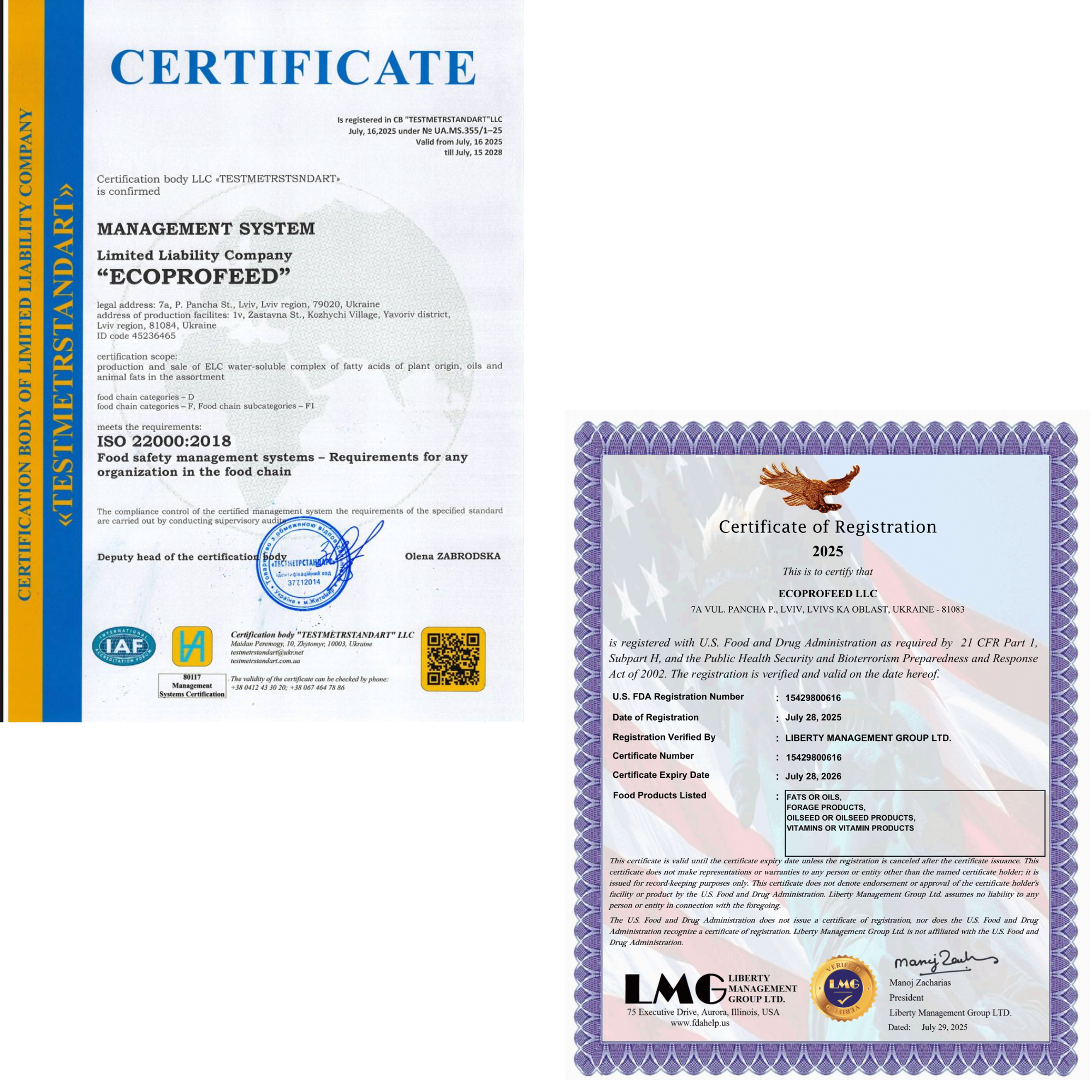 Компанія Ecoprofeed отримала сертифікати ISO 22000, НАССР та FDA – найвищу ознаку якості.
